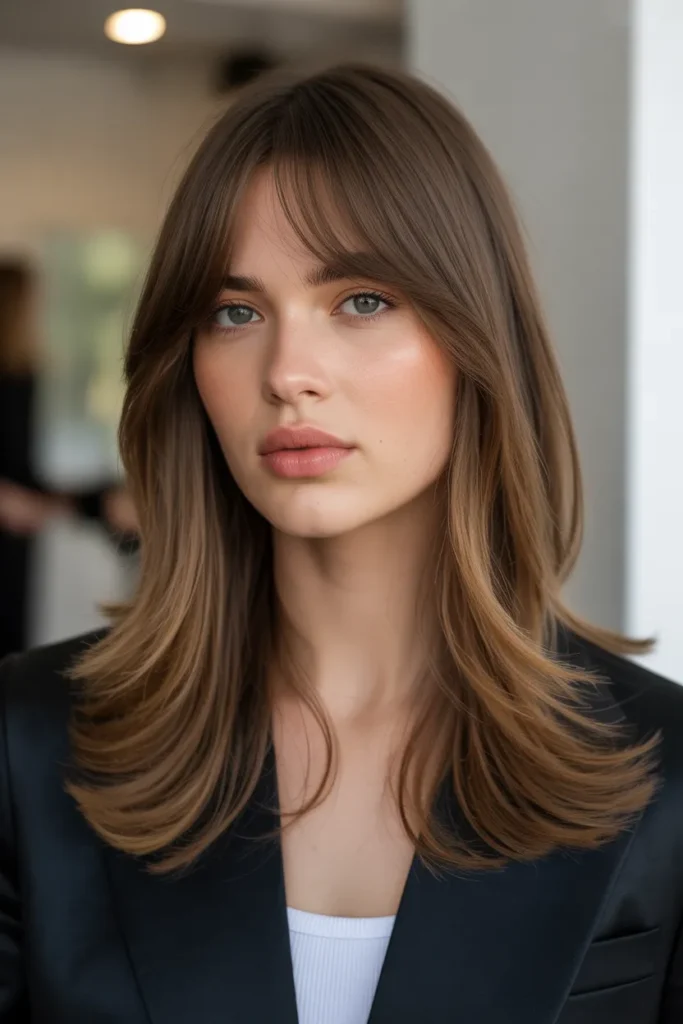 Side-swept curtain bangs paired with long layers create a soft, voluminous hairstyle that enhances natural movement. The side-swept bangs draw attention to the eyes and cheekbones, while the layers add lift and body throughout the length of the hair. This hairstyle works for all occasions, from casual outings to formal events, offering a balanced combination of elegance and effortless charm. Styling products like volumizing mousse or light curl sprays help maintain fullness and define layers, keeping the hair looking lively and polished. The overall effect is a sophisticated, contemporary hairstyle that highlights facial features and enhances volume naturally.