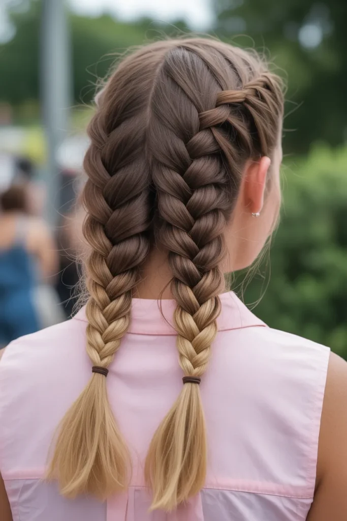 Double fishtail braids are a fun and practical way to style medium-to-long hair. By creating two symmetrical braids, this style keeps hair neatly secured while adding a visually appealing structure. In my experience, it works well for casual outings, festivals, or everyday wear because it balances charm with functionality. The symmetry draws attention to the braid’s intricate weaving, making hair appear thicker and more textured. It’s a versatile style that complements various outfits and settings, and slight loosening of strands near the face softens the look for a relaxed, approachable aesthetic.