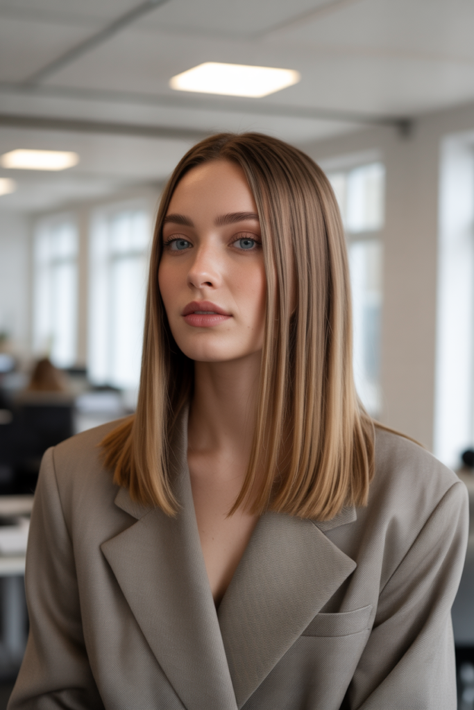Styling is simple: a flat iron and lightweight serum create a glossy finish, and tucking one side behind the ear adds sophistication. This length works for most face shapes and is low-maintenance while still looking intentional. The sleek lob pairs effortlessly with both formal suits and modern office separates.