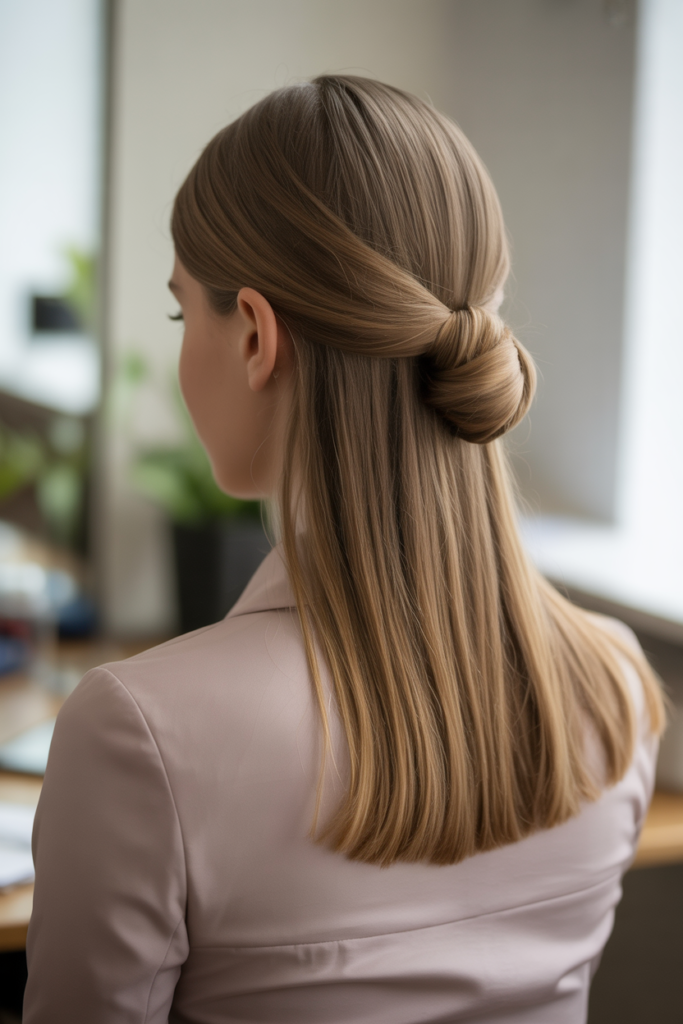 Creating this hairstyle involves twisting sections from both sides and securing them into a small bun at the back, leaving the lower strands free. A smoothing serum ensures a sleek finish, while minimal accessories maintain a sophisticated office-ready appearance.