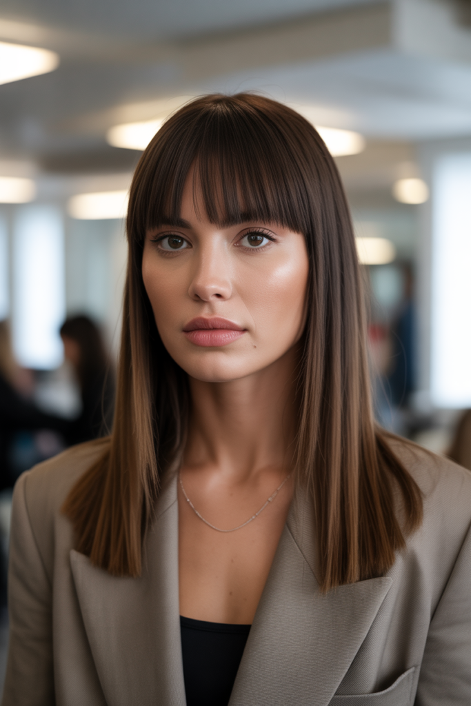 Regular trims are essential to maintain the crispness of blunt bangs, while straightening irons help keep the hair sleek. This style pairs well with high-neck tops or collared blouses, making it versatile for office fashion. The combination of bangs and straight hair projects confidence and precision in a workplace setting.