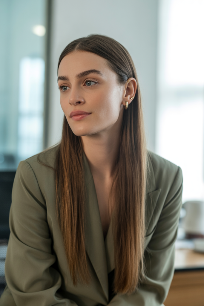 Center-parted long hair is a simple yet impactful hairstyle in 21 Hairstyles for Work Sleek Office Ready Inspo. The symmetry of the part creates a balanced, professional look, while the long straight strands maintain elegance and sophistication. This style communicates reliability and polish, ideal for client-facing roles or corporate environments where neatness is essential.