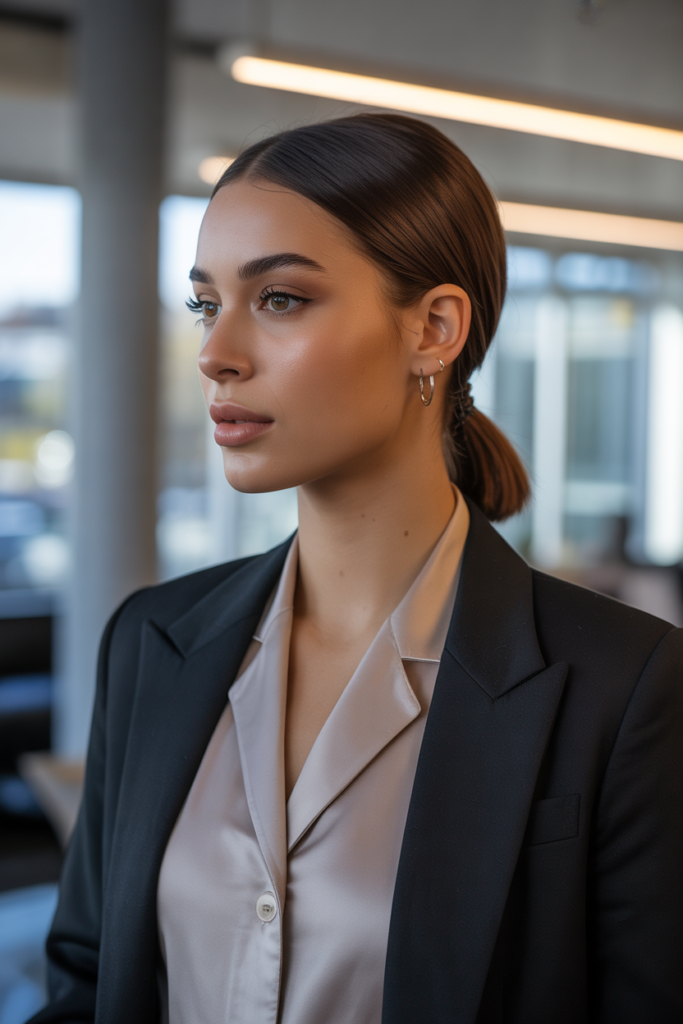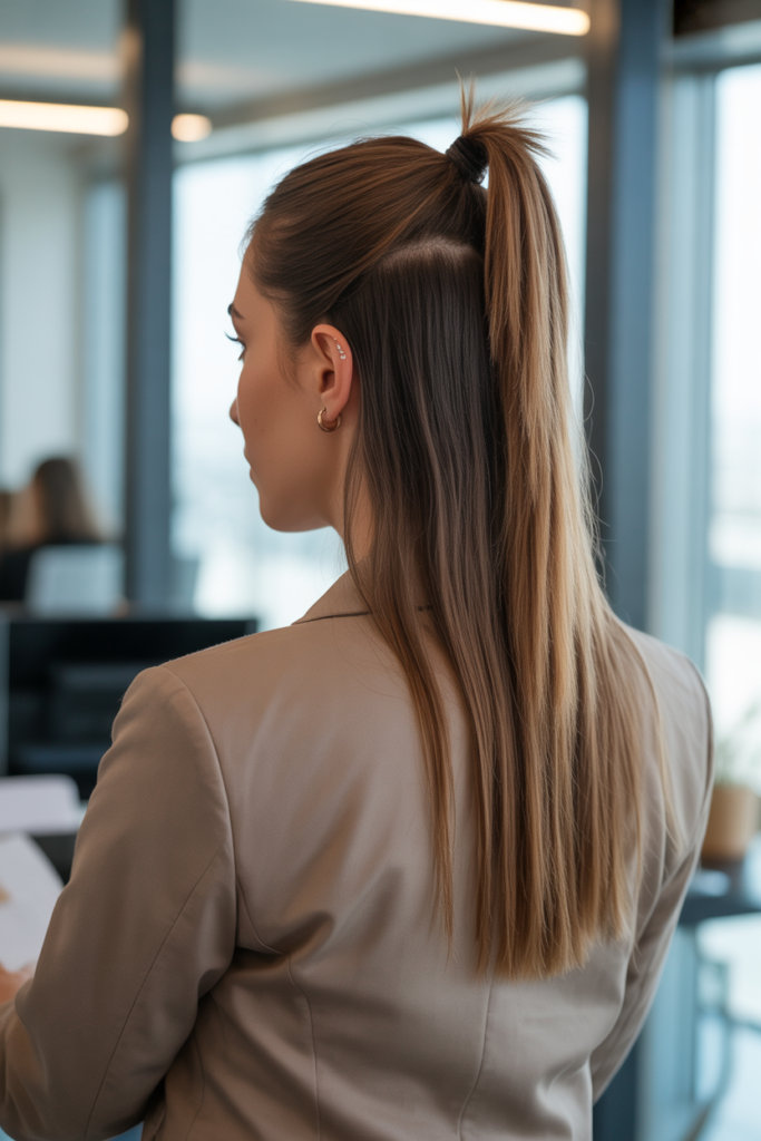 Achieving this look requires smoothing hair upward with a fine comb and securing it tightly at the crown. Using a flat iron for the ends ensures they stay sleek and straight. This ponytail pairs well with structured blazers, bold earrings, or minimalist office outfits, making it a versatile option for everyday office wear.