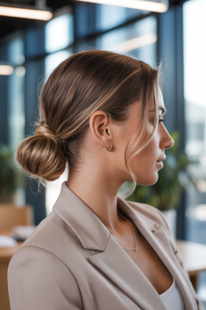 The low side bun with volume is a sophisticated and chic hairstyle in 21 Hairstyles for Work Sleek Office Ready Inspo. The slight lift at the crown adds elegance, while the side placement keeps it unique yet professional. This hairstyle is perfect for both everyday office wear and special work events where a polished appearance is needed.