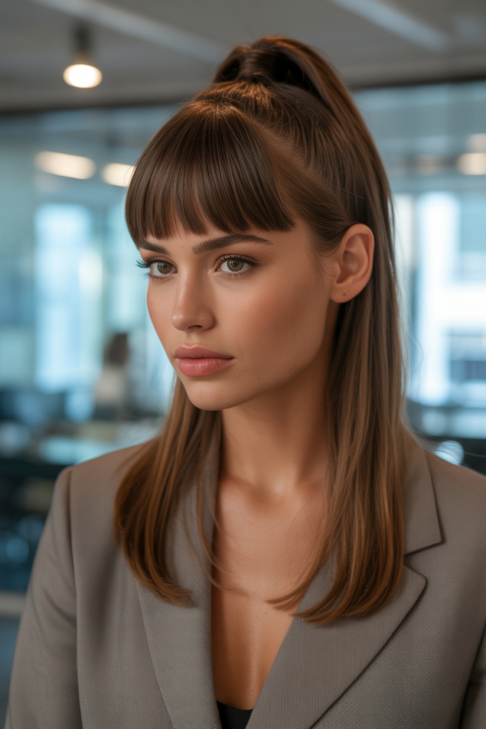 The sleek high ponytail with a blunt fringe is a bold and modern option in 21 Hairstyles for Work Sleek Office Ready Inspo. The blunt fringe draws attention to the eyes, while the high ponytail creates a strong, professional silhouette. This style is perfect for offices where polished yet fashionable hairstyles are appreciated.