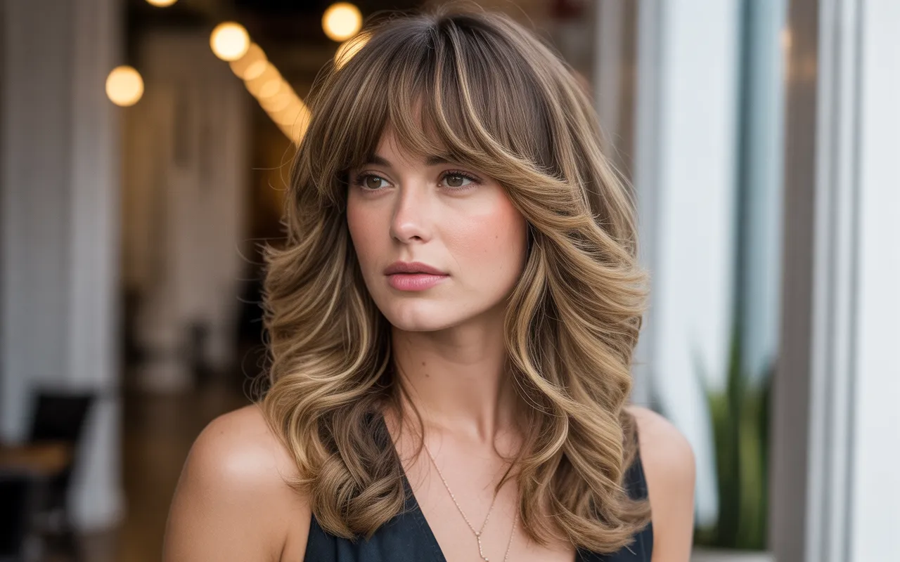 Soft bangs work beautifully with voluminous layers because they frame the face without making the hairstyle feel heavy. The gentle layering helps the bangs fall naturally, creating a flattering and balanced look. This style highlights the cheekbones and adds softness to the overall haircut.