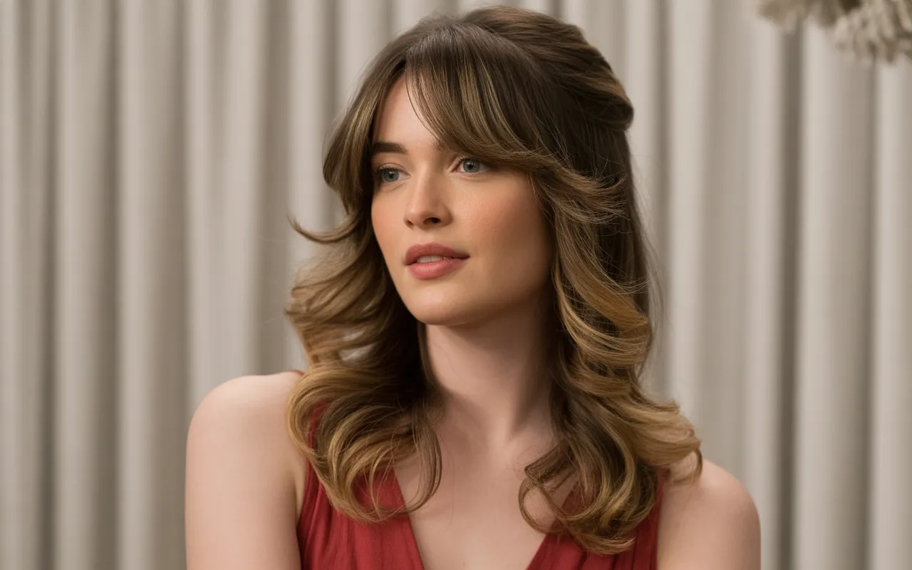 The combination of layers and curtain bangs ensures a flattering and stylish look for every face shape. Curtain bangs soften the features, while layers allow waves to flow naturally without looking heavy. This hairstyle balances elegance and modern trends, offering a versatile option for special events. Styling can be tailored to personal preference, whether loose romantic waves or more structured curls. Overall, this look is ideal for women wanting an effortlessly glamorous appearance with minimal fuss, combining style, versatility, and timeless beauty.